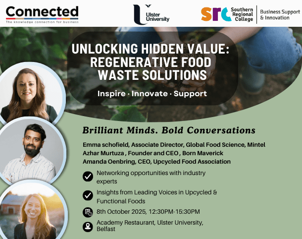 We’re excited to invite food industry leaders, innovators, and changemakers to “Food 5.0: Data-Driven, Sustainable, and Market-Ready” – a special event delivered with Ulster University and funded by ConnectedNI.
