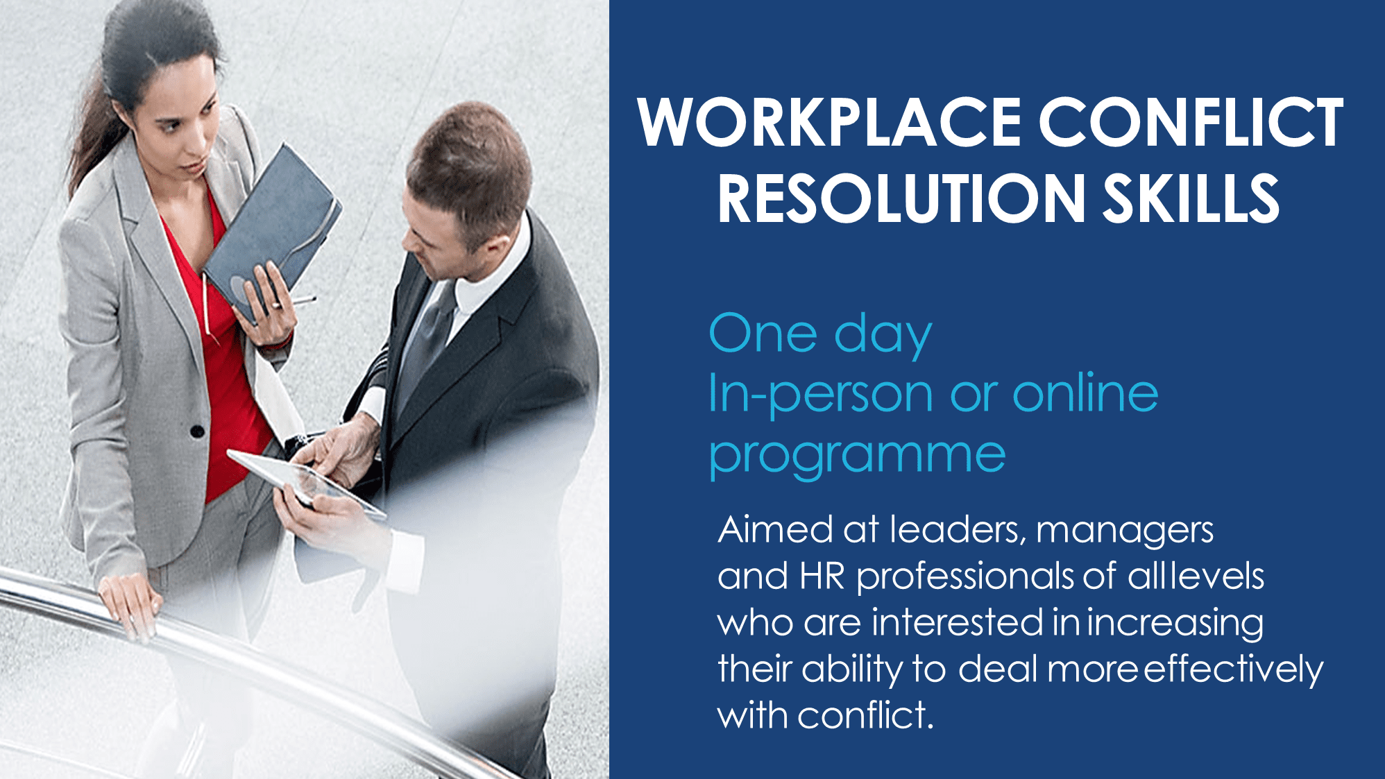 The programme is aimed at leaders & managers, and HR professionals of all levels who are interested in increasing their ability to deal more effectively with conflict.