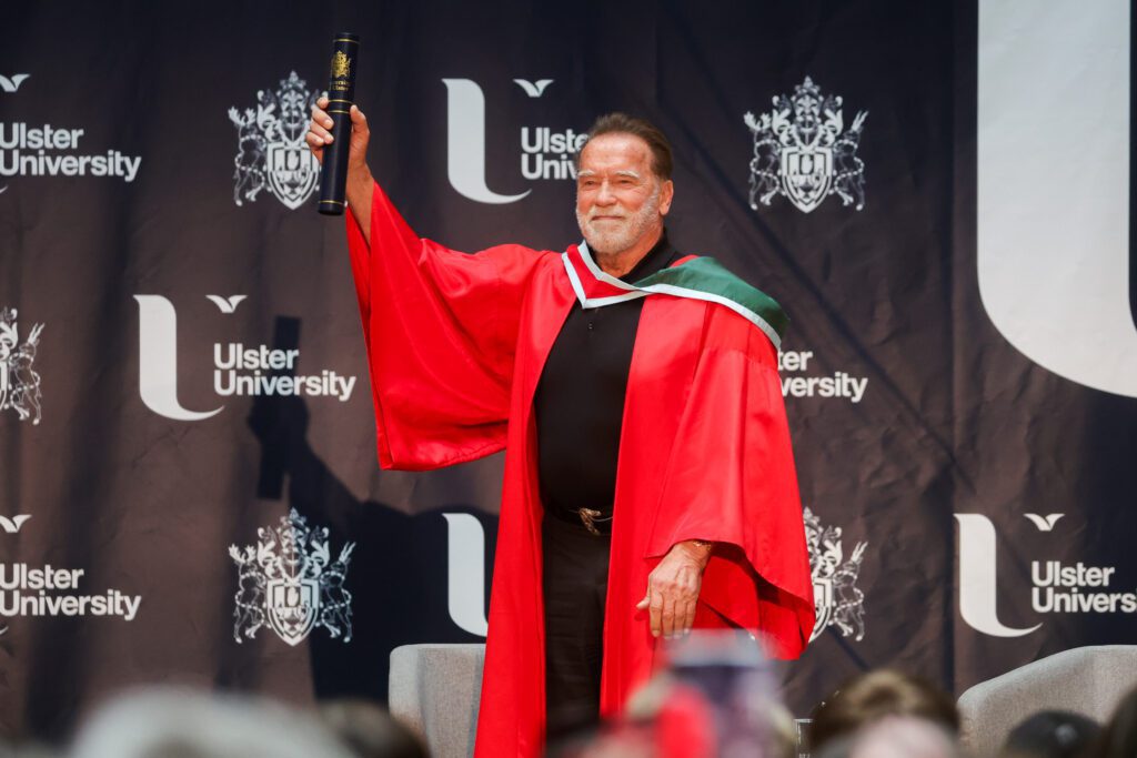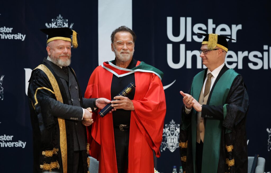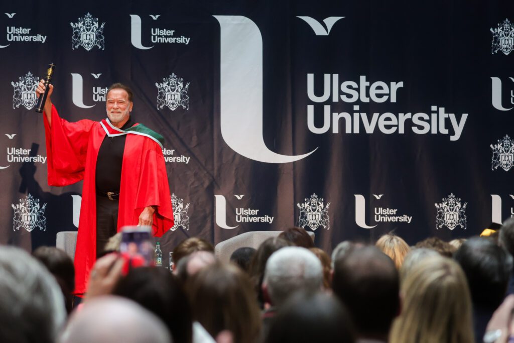 Dr Schwarzenegger’s visit aligns with Ulster University’s growing role in the future of film, television and digital storytelling. Honouring one of the world’s most recognisable figures in film-making reflects Ulster University’s commitment to developing the next generation of creative talent and technology through Studio Ulster, a ground-breaking $96 million, state-of-the-art Virtual Production studio complex. In addition, the University is advancing research and innovation in virtual production and next-generation screen technologies through its CoSTAR Screen Lab within Studio Ulster and via Ulster Screen Academy, relevant and cutting-edge courses produce highly skilled graduates ready to excel in one of the fastest growing sectors of the economy.